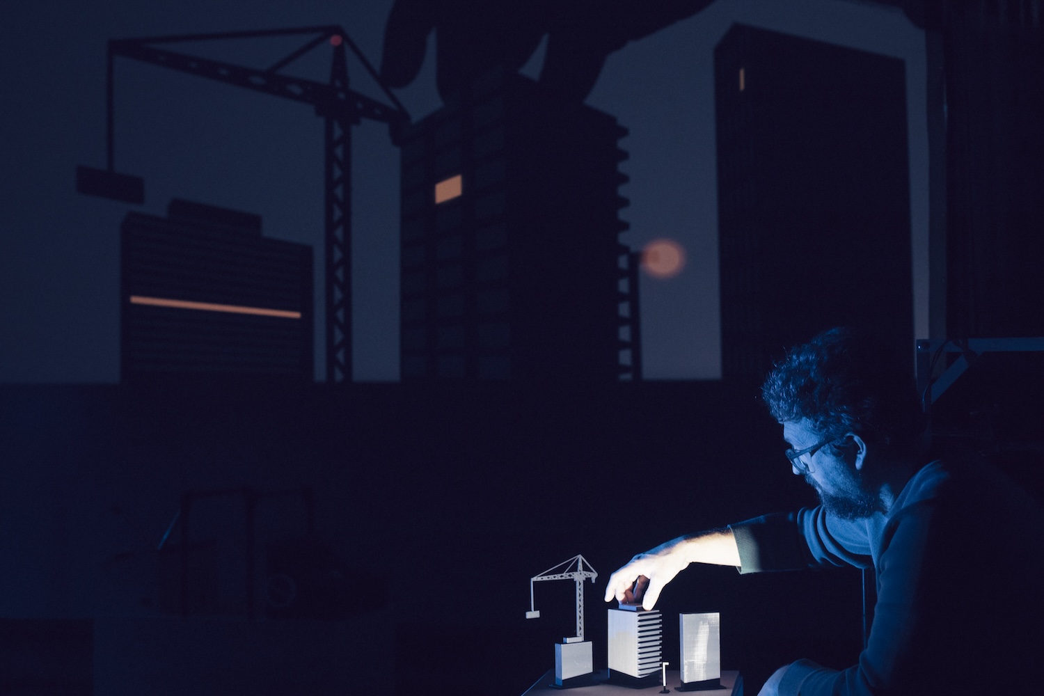Un des souhaits dans cette nouvelle création est d'occupé un peu plus le plateau et notamment le centre de la scène, par des objets /modules autour desquels nous pourrons intervenir, faire une partie de l'image avec des dispositifs analogiques, ombres, optique, lumière, maquette, ... le film se déploit aussi au plateau.