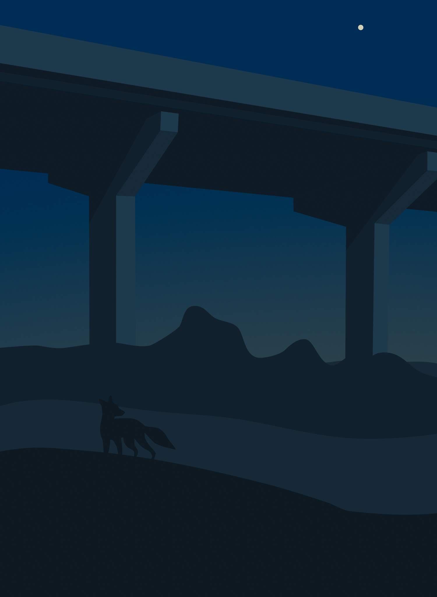 Dehors, c’est une zone commercial périphérique, espace-lisière entre ville et ailleurs. Des ombres furtives traversent les espaces. On reconnaît les sons de certains animaux mélangés aux sons de la ville. Tout à coup RENARD débarque, il avance à pas de velours, il suit une silhouette humaine vêtue de manière étrange. Elle aussi glisse à moitié cachée par les ombres de la nuit. Devant un entrepôt à moitié abandonné, elle se met à peindre sur l’un des murs. C’est un énorme portrait de RENARD qui apparait, il nous regarde dans les yeux. Le graffeur porte un masque, on dit que personne n’a jamais vu son visage. Il nous parle de son amour pour la nuit, pour les espaces qui semblent vides, pour les vies qu’ils abritent. Plus loin RENARD le regarde, il file et nous le suivons, il court ! On traverse la ville à hauteur de renard : par des passages, des corridors et des failles. Des chauves souris, des sangliers et des hérissons se joignent à lui, un jeu de cache-cache entre animaux sauvages se déroule au beau milieu de la ville.